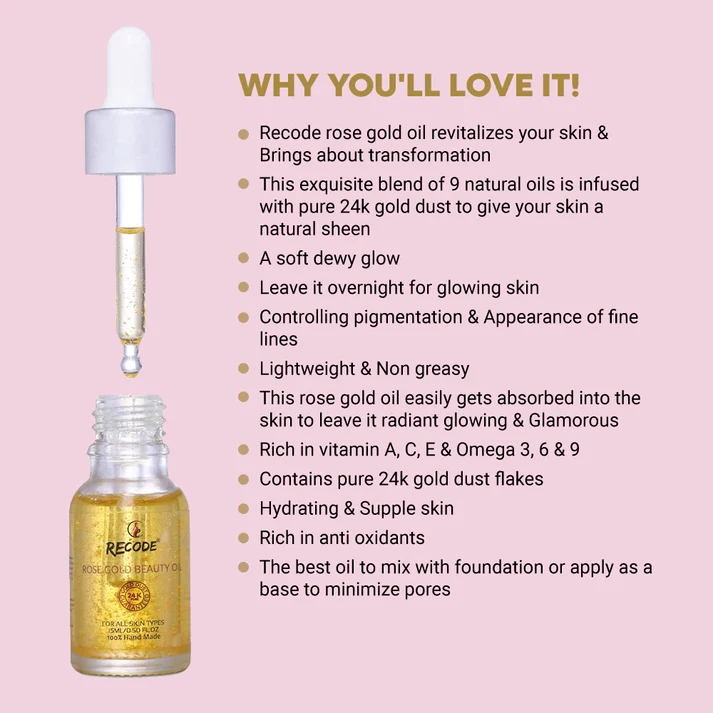 Recode Rose Gold Oil revitalizes your skin and brings about transformation, This exquisite blend of 9 natural oils is infused with pure 24K Gold Dust to give your skin a natural sheen.