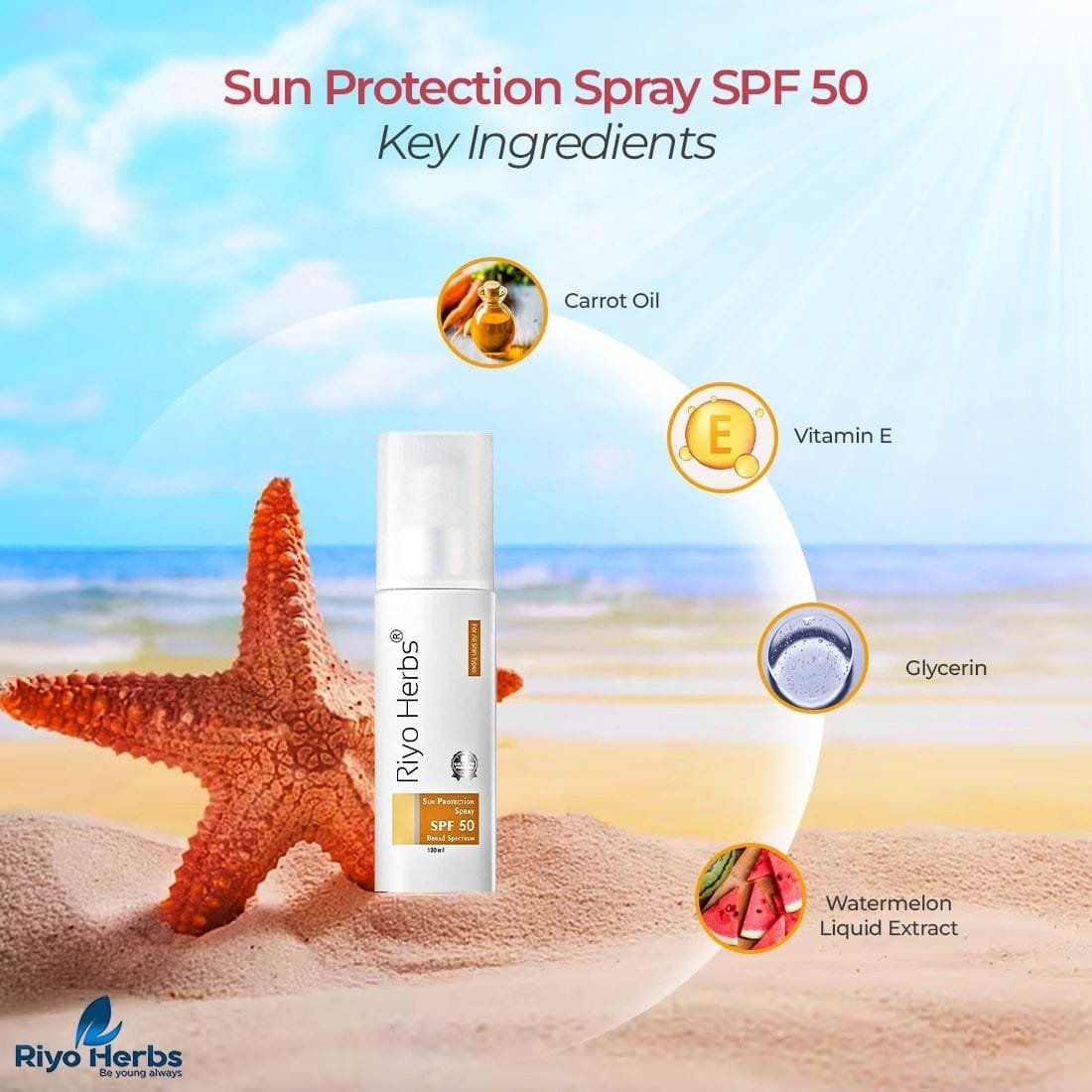 - Broad spectrum SPF 50 spray with the goodness of carrot oil, watermelon extract, and Vitamin E.